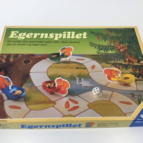 Egernspillet, Familiespil , brætspil, Komplet pånær 5 grankogler (kan sagtens spilles alligevel). Terningen er ikke den originale - når terningen viser 6 prikker er det der, hvor der skulle være en kogle. Pæn stand