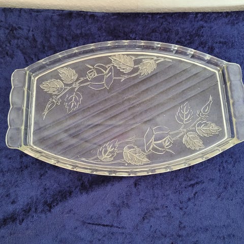 Gammelt elaboreret glasfad, formodentlig fra 1930'erne med et væld af ydre dekoration. Kanten formet med takker, i hele fadets omkreds dekoration som en stjerne og det samme i bunden som midterdekoration. Diameter 29 cm, højde 4 cm. Afslag på en af de 84 takker!