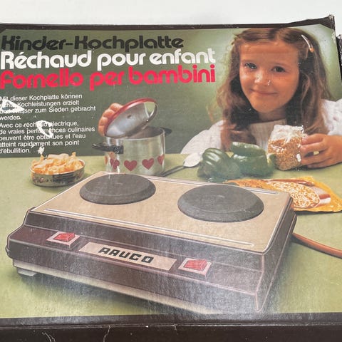 Køkken, Komfur med div tilbehør, Komfur i original æske fra starten af tresserne med div. tilbehør. Det er muligt at lave mad på 2 af blussene, idet de er beregnet til sprittabletter. Man er velkommen til at komme med et bud.