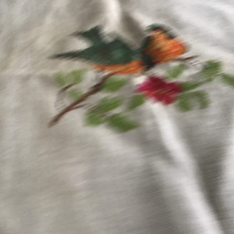 Broderier, Blå løber/lysdug 74x24cm. 50kr.