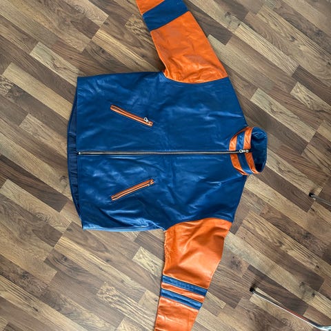 Jakken har to små ca. 1 cm skrabber på læder delen (ikke et hul gennem jakken) som kan ses på billederne.