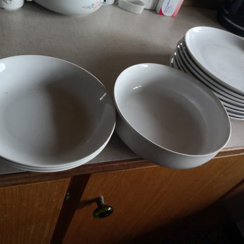 Porcelæn, flad tallerkener, Studio, 4 stk. dybe tallerkener i hvidt med blå dekoration diameter 24 cm.