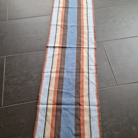 vævet & købt 1960 i San Martino di Finita en landsby med albansktalende befolkning, efterkommere fra indvandring af albanere i 1400-tallet på flugt fra osmanerne. 49x125cm og vist af uld. Lidt falmet. I det traditionelle mønster indgår en figur baseret på den dobbelthovedet sort ørn på en rød bund > et heraldisk symbol af folkehelten Skanderbeg