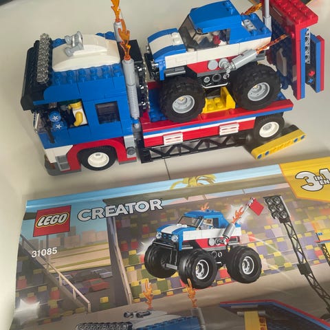 Sæt med tre forslag til design af monster trucks, men med en masse løse dele til selv at bygge nye modeller fra egen fantasi.