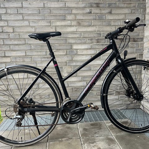 Damecykel, Nishiki, 48 cm stel, 24 gear, Nishiki Race Hybrid Comp, T 6 Aluminium, stel 48 cm, 24 udv. gear shimano, håndbremse for og bag, refleks i hjul, flaskeholder, berendsstyr, hjul/dæk 28" x 1 5/8 x 1 1/8, nyserviceret, kører godt.