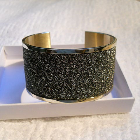 Det meget smukke armbånd er udført i forgyldt stål med sort emalje med forgyldte pyntepyramider eller trekanter. .