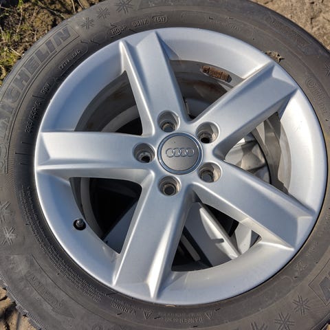 Stålfælge, 16", Audi, 205 / 55 / R16, krydsmål 5, vinterdæk, Michelin, 5 mønster, fælge med dæk, Originale Audi vinterhjul og har siddet på en Audi A3