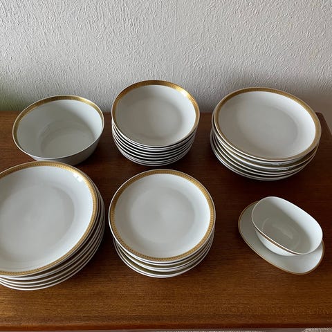 Porcelæn, Middagstallerkener , Lyngby, Trend hedder stellet. Rigtig fine også til jul! Middagstallerkener 8 stk med guldkant - super smukke og alle i fin stand og uden skår.