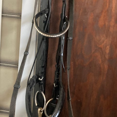 Meget smuk eksklusiv helt ny Passier trense med Skærlund design pande og næsebånd, 4 cm. med tilbagetræk, messingspænder. Sort. Stenene er krystal og grøn. Størrelse full.