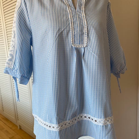 Sød tunika / bluse der måler ca. 61,5 cm. fra skulder til bund. Den lukkes med en enkelt knap i nakken.