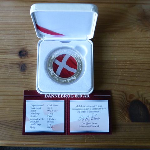 Danmark, mønter, 5$, 2019, Dannebrog, 800 År, 1219 - 2019. I original emballage.