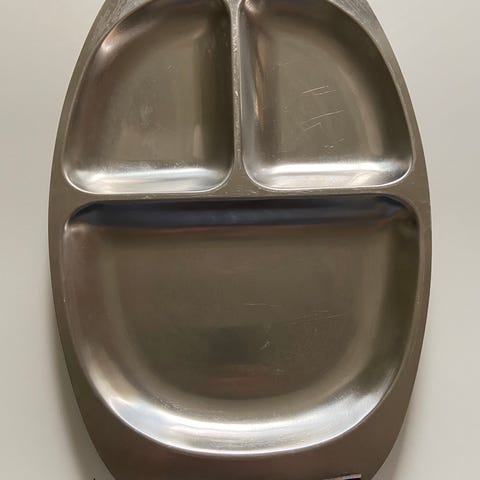 Fad, Stort retro serveringsfad i rustfrit stål med teak håndtag. L 40, B 27 cm