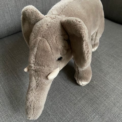 Mindre elefant, Wild republic, Sød sød elefant, grå, købt i zoologisk have. Med grøn trøje med hætte.