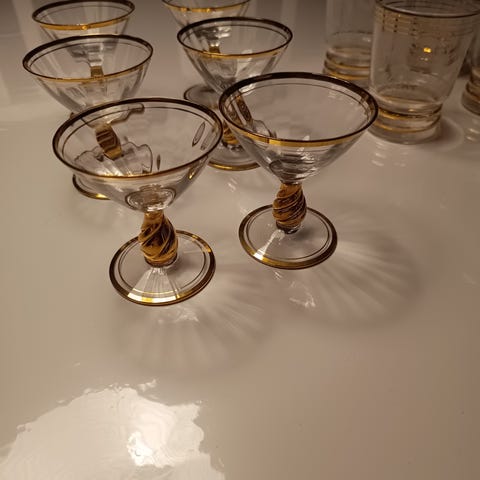 Gamle glasting, meget gammel lille glassamling bestående af oldemors glasfad til kam og hårnåle, et lille skrin af glas (beskadiget) og en billedramme (af messingtråd?) også fra oldemors tid. Sælges samlet for