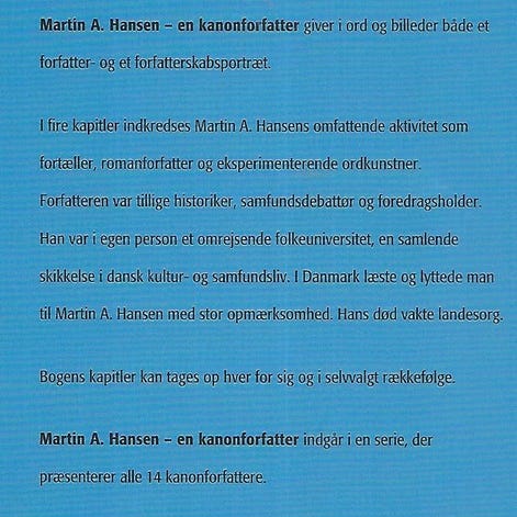Martin A. Hansen – en kanonforfatter lader i ord og billeder forfatteren og hans forfatterskab træde klart og levende frem. I bogens fire kapitler indkredses Martin A. Hansens omfattende aktivitet som fortæller, romanforfatter og eksperimenterende ordkunstner, og som historiker, samfundsdebattør og foredragsholder.
