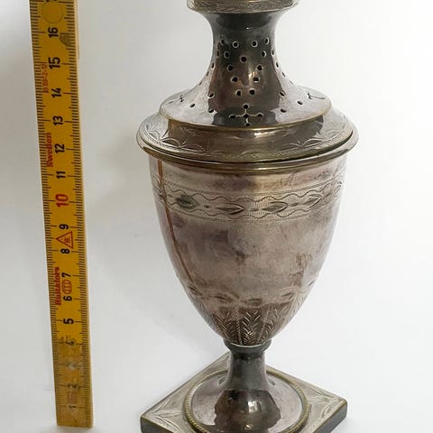 Sønderjysk (Sydslesvigsk) barok strøbøsse af sølv, Barok strøbøsse af sølv fra Martin Topf, født i 1719 og bliver borger i Bedsted i Sydslesvig, som dengang var dansk. Martin Topf døde i 1782. Strødåsen har graverede ejernavne i bundkanten. Den ældste 1774. En mindre indgravering fra 1991.
