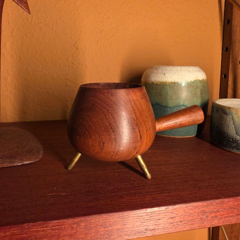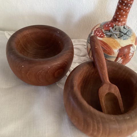 Teaktræ saltkar med lille ske. Til fingersalt. Med små brugsspor. d. 6,5 cm h 3,5 cm