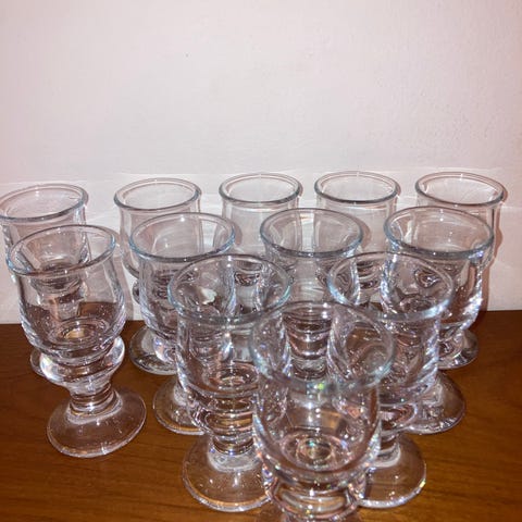Kraftigt glas med glat kumme og stor knop på stilk, flad fod.