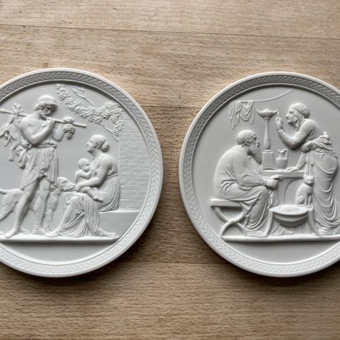 Bertel Thorvaldsen platte vinter, Royal Copenhagen, Vinter i rigtig fin stand Siden første halvdel af 1800-tallet har Bertel Thorvaldsen (1770-1844) været betragtet som en af sin tids vigtigste og mest indflydelsesrige billedhuggere. Thorvaldsen blev født i 1770 i København og blev allerede som elleve år gammel optaget på Det Kongelige Danske Kunstakademie. Hans talent gav ham den fine guldmedalje fra Royal Academy of Fine Arts og dets rejsestipendium, der tog ham til Rom i 1797. Den dag Thorvaldsen ankom dertil, til datidens absolutte kulturelle centrum for klassisk kunst og dens dannelse, kaldte han sin åndelige fødselsdag. I den evige by kom Thorvaldsen for at bo og arbejde det meste af sit liv, indtil 1838. Thorvaldsen arbejdede som billedhugger inden for neoklassicismen og havde et stort atelier i byen. I stilen, der er baseret på harmoni, balance og ophøjede menneskelige idealer, ikke sjældent spejlet i antikkens mytologi, skabte han en række mesterværker; statuer, relieffer, portrætter og monumenter. I Rom kaldte han sig Alberto, hvorfor initialerne AT (Alberto Thorvaldsen) vises på nogle af hans skulpturer. Dette navn blev almindeligt kendt, og med tiden modtog han kommissioner fra kongelige kommissioner og fyrstehuse i Europa. Thorvaldsen var hovedkonkurrent til Antonio Canovas (1757-1822) ære og derefter, efter den venetianske mesters død, som den vigtigste billedhugger i Europa, mentor for en lang række unge meget talentfulde kunstnere. Thorvaldsen og Canova forvandlede selve ideen om skulptur og dens teknikker til at skabe kunstværker, der inspirerede deres samtidige og generationer af deres tilhængere.
