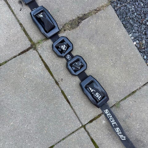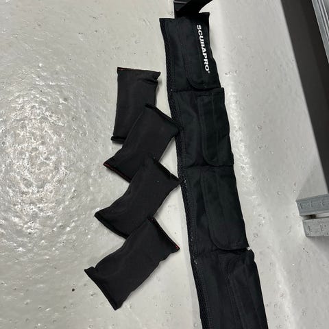 Vægtbælte Scubapro, 92 cm i det stykke hvor der er plads til 5 vægt plader. Brugt meget sparsomt. Nypris 319,-Porto deles