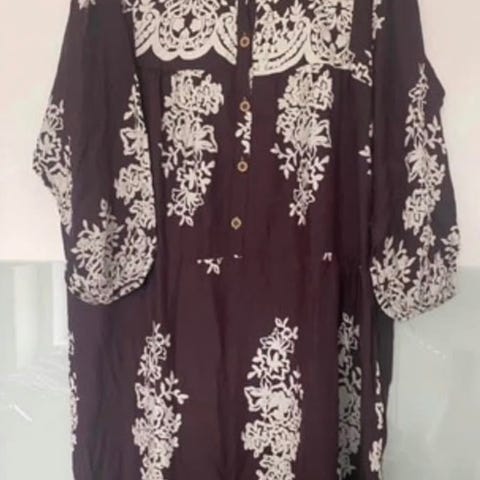 Lang grøn kjole til dame i str. M. Kjolen har lange ærmer med blonde-detaljer for enden samt bælte i taljen. Lukning bagpå med lynlås og knapper ved halsen. Foret indvendigt for bedre pasform og komfort. Velegnet som finkjole eller til formelle anledninger.