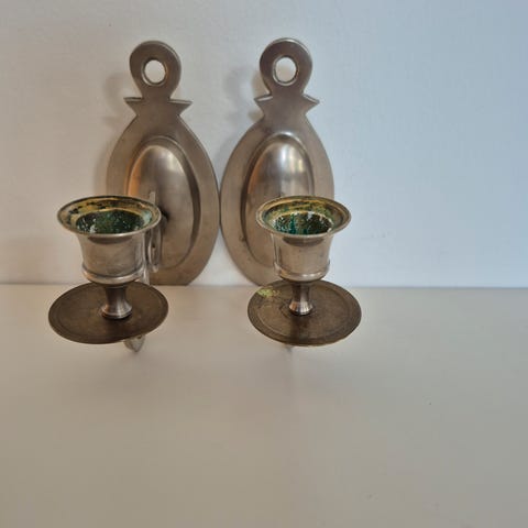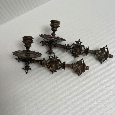 Antike klaverlysestager i messing med dekorative detaljer. Sættet består af to stager med tilhørende beslag, designet i en klassisk stil med ornamentale mønstre. Materialet er massiv messing, hvilket giver en robust og holdbar konstruktion. . Stagerne måler cirka 30 cm i længden.