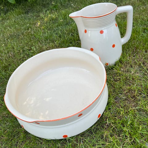Vintage servantesæt, Antik med blomster, Flot lille servantesæt med lilla kant og fine blomster. 28 cm i diameter og 6 cm højt. Kanden er 18 cm høj. Der er en hårstreg øverst ved hanken, og et mini skrab på kanten.