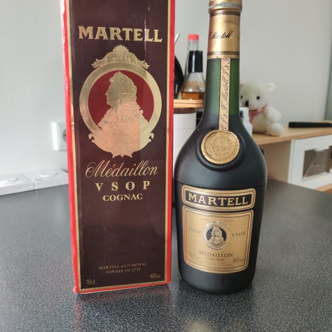 Vin og spiritus, Cognac, Martell V.S.O.P. Medaillon Cognac, Flaskerne er nok fra 1980'erne. Prisen er for 3 flasker.