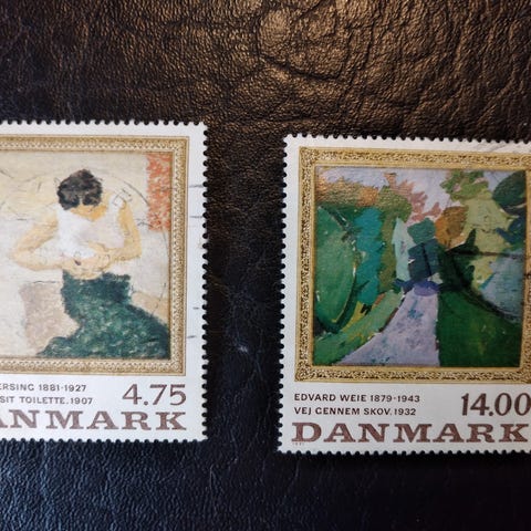 Souvenirmapper med danske malerier med, afa 816 C.W Eckersberg, Afa 817 N. Abildgaard, afa 921 Peter Hansen, afa 922 Fritz Syberg, afa 949 Christian Købke, Constantin Hansen, afa 1005 Harald Giersing, afa 1006 Edvard Weie, afa 1032 J th. Lundbye, afa 1033 P.C. Skovgaard, afa 1057 Wilhelm Lundstrøm, afa 1058 Franciska Clausen.