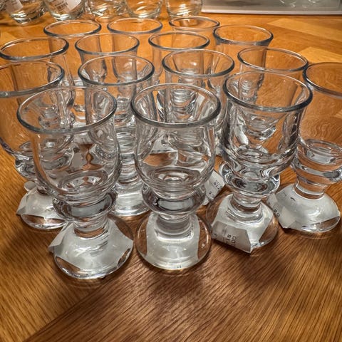 Kraftigt glas med glat kumme og stor knop på stilk, flad fod