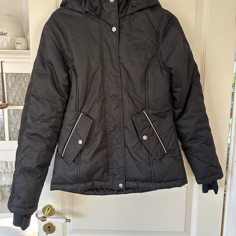 Jakke, HALVLANG OVERGANGSJAKKE, HUMMEL, str. 152, Super flot halvlang overgangsjakke fra HUMMEL. Den er vandtæt og åndbar. Hætten kan tages af. Den lukkes med lynlås og velcro, og der er reflekser på lommerne, forneden på ærmerne samt forneden bagpå.
