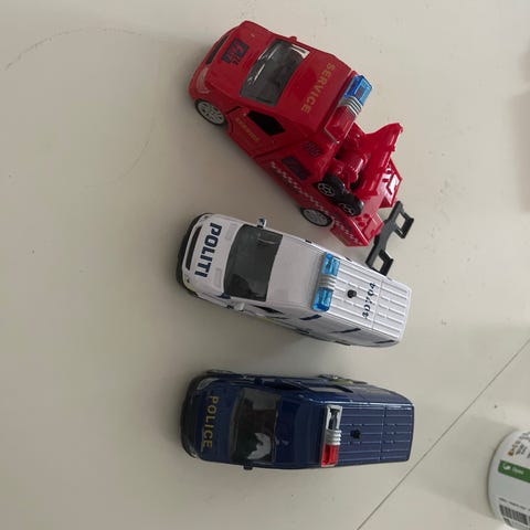 Brandbiler og 1 politibil med garager