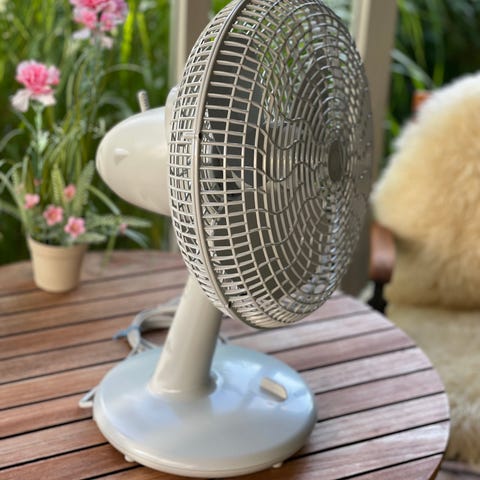 Bordventilator, fan, blæser, Retro transportabel bordventilator. Den måler 17x14cm. Pladsbesparende. Og nem at tage med til fx campingvogn, telt eller festival, da den kan bruges med batterier i 300 timer. Se beskrivelse på billederne. Den er ubrugt.