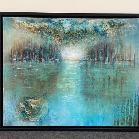 Akrylmaleri, LGB, motiv: Landskab, stil: Andet, b: 97 h: 67, Upcycle maleri. Et gammelt lærred er malet over med nye strøg og farver, men med samme motiv så noget af det oprindelige titter frem.