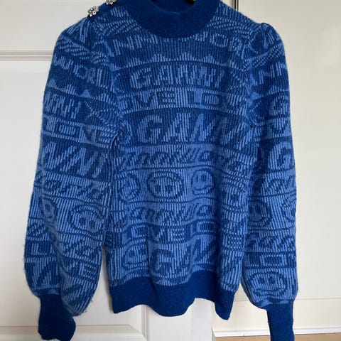 Smuk og blød cashmere bluse/sweater i nuancer af grå fra Ganni. Blusen lukkes med tre krystalroset knapper på skulderen. Størrelse small. Passer en størrelse 34-36.