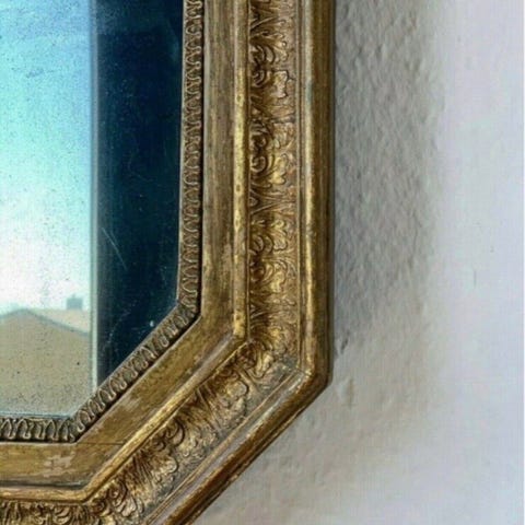 Spejl, Træ med guld, 200 år gl., Smukt antikt spejl guld bemalet med fine udskæringer og øverst udskåret våben skjold originalt antikt spejl i sat. ...vurderet hos auktionshus for flere år siden til 4000 kroner bredde 32 cm længde med udskæring 60 cm