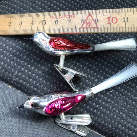 Fugle julekugle, Har dette par jule fugle, røde med guld på, og begge er flotte og i orden, sælges samlet