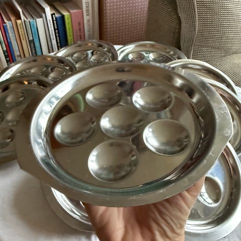 Rustfrit stål, 2 forskellige snegle pander, 2 rustfrie og 2 støbejerns skåle/pander til 150 pr/par.