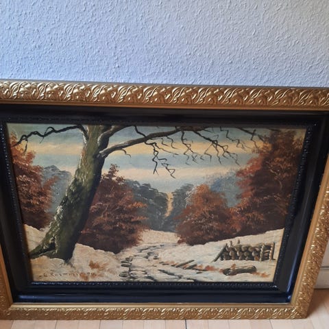 Oliemaleri, Marx Wrem, motiv: Landskab, b: 46 h: 31, Maleri af Marx Wrem. Olie på lærred, 24 x 39 cm. Mål med ramme 31 x 46vcm. Signeret i monogram MW, indridset under monogrammet Max Wrem. Valby Teglværk i sne. Et par små afskalninger (retoucheret - se foto). Generelt meget pænt. Ramme med skrammer. Kan sendes til pakkeshop for kr. 60.
