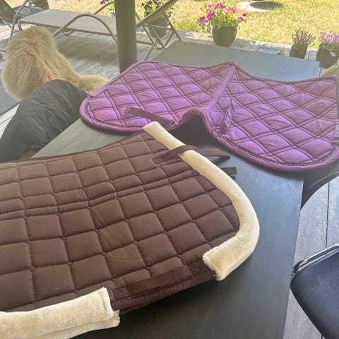 Underlag, Sadelpad og læder grime, Sadelpad til beskyttelse af hesteryg under sadlen. Lædergrime til hest str. full. Begge dele af god kvalitet. Sælges 200 kr. pr. stk. Afhentes ved Varde.