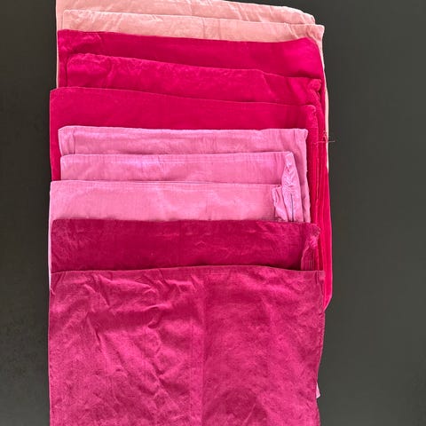 Rød, grå, blomme, pink, mørklilla, sort, lime, støvet gul og en smuk blå.