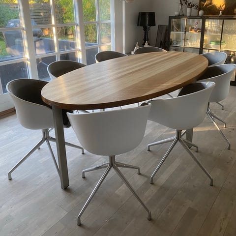 Spisebord, Eg, Møller Refurbished Oak, b: 96 l: 196, Nyt egetræsbord bygget af genbrugsmaterialer. Bordet er renoveret og modificeret og fremstår som nyt. Bordet er et redesign af GM 2100 Naver Collection og således en af det ypperste bordplader der kan købes. Nyprisen på det oprindelige GM 2100 bord er omkring 40.000 kr. Bordet er i 40 mm massiv eg og med bordplade i fuld stavlængde. Der medfølger to tillægsplader i samme materiale og udseende med størrelse på 50 x 100 cm (bredde x længde). Bordet fås også i størrelse 80 x 155 cm. Prisen er inkl. behandling med olie. Bordet på billederne er behandlet med Rubio Monocoat Natural olie. Levering og indbæring (inkl. montering af ben) kan tilkøbes.