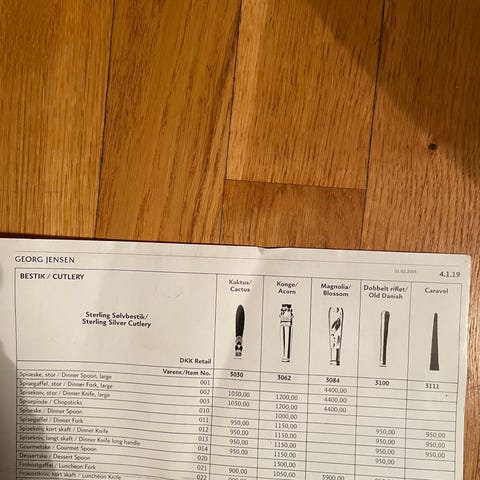 Konge:kagespade l: 17,5 cm, sildekaffel l: 11 cm, 4 stk teske 11 cm. . Alt særdeles velholdt. Pris fra kr 250 til kr 1265 pr stk. Dronning: pålægsgaffel l: 12 cm, sukkerske/marmelade ske l: 13 cm, kagespade med i sølv og horn l: 20,5 cm , priser fra kr 400 til kr 1200. Kan sendes efter aftale