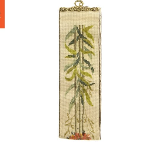 Håndbroderet korssting på hør og monteret på messing stang.