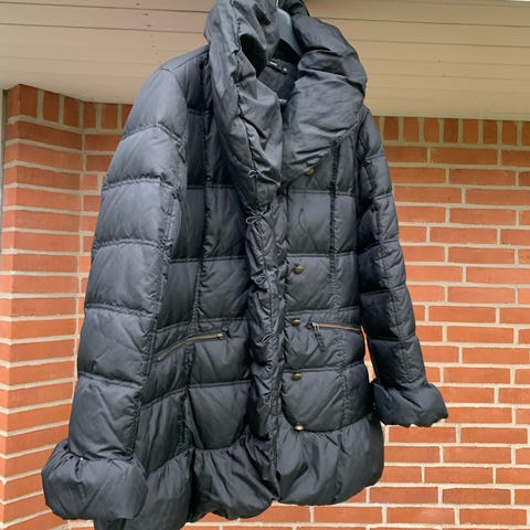 Vinterjakke, str. 38, Canadiens, Sort, Dunjakke, God men brugt, Skøn og varm canadisk produceret dunjakke med bælte og duffelknapper i horn. En jakke du kan holde varmen i. Pelskant og hætte kan knappes af (hver for sig) så mulighed for flere udtryk.
