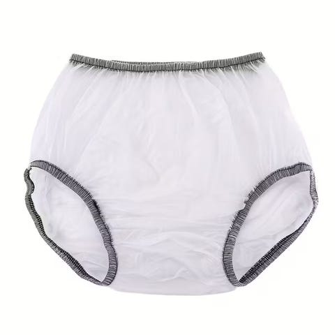 Plastikbukseri flere farver (gennemsigtig, pink, blå, orange) med elastisk talje og benåbninger. Materialet er plast, designet til engangsbrug eller genbrug afhængig af behov.