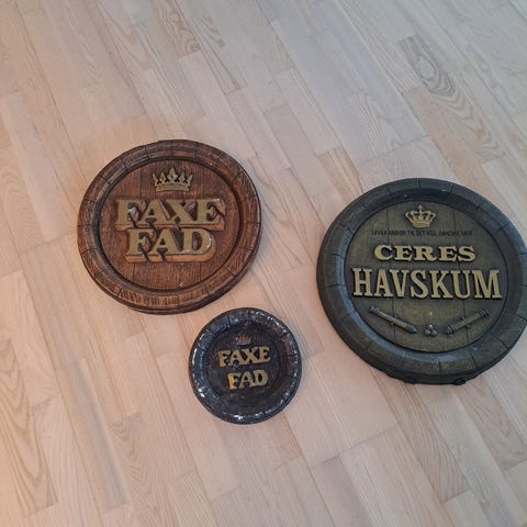 Skilte, FAXE FAD øl skilt, Ældre FAXE fad øl skilt i gips, ikke fiber som alle de andre. Vægt 1,5kg. Diameter knap 30cm. Købt brugt på marked sidst 80’erne.