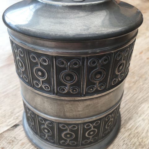 Bæger af tin., Engelsk, Kan rumme ca en halv liter. Hanken er en nøgen dame. Har lidt små buler - se sidste billede. Højde 13 cm.
