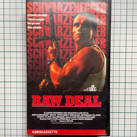 Action, Raw deal Schwarzenegger, Gammelt dansk vhs video bånd med Arnold Schwarzenegger