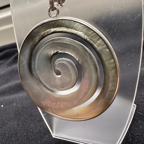Meget smuk perlemors smykke med tre indkapslede perler, så man virkeligt kan se og måske forstå hvorledes perler bliver kreeret i en musling.